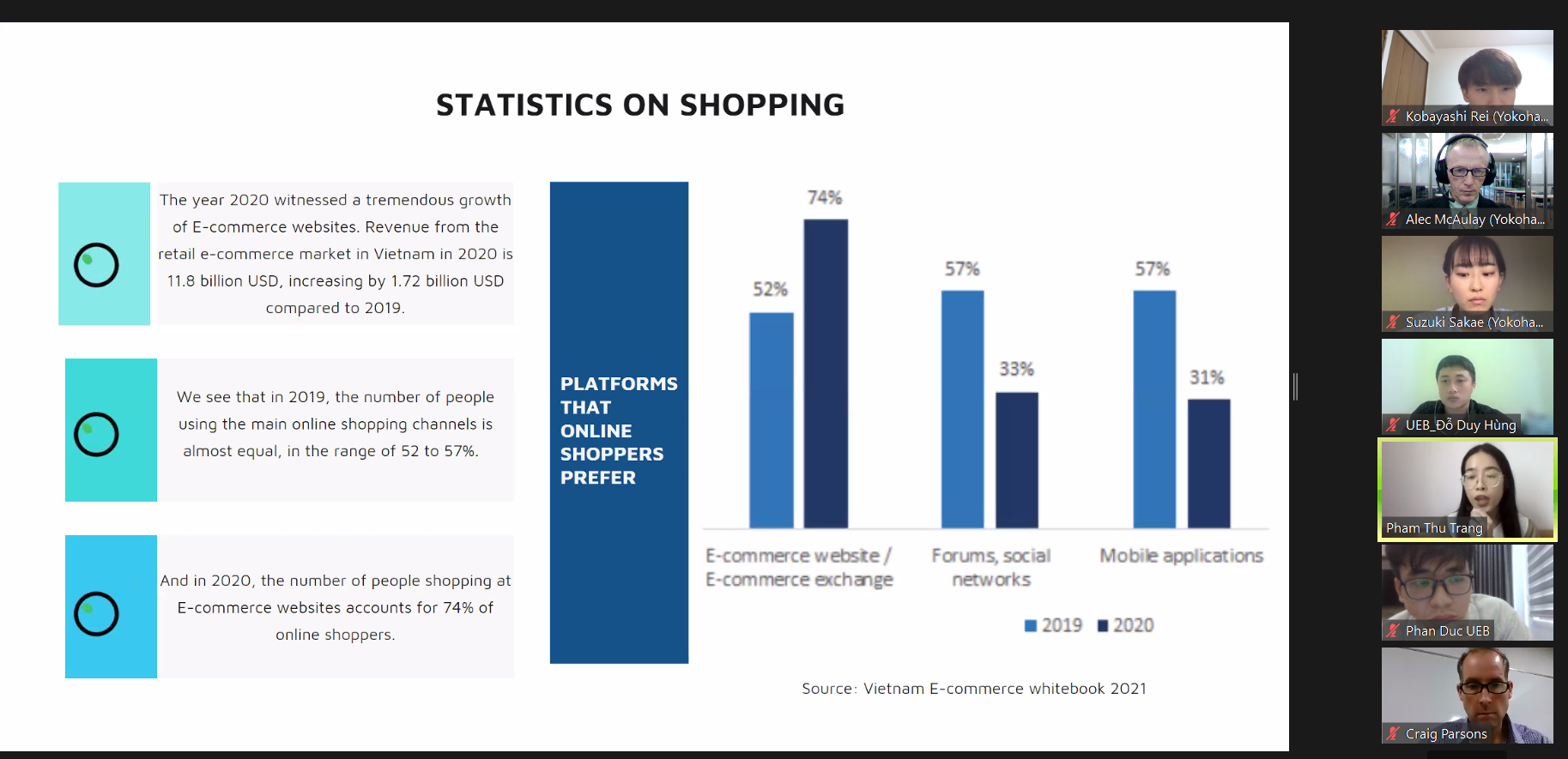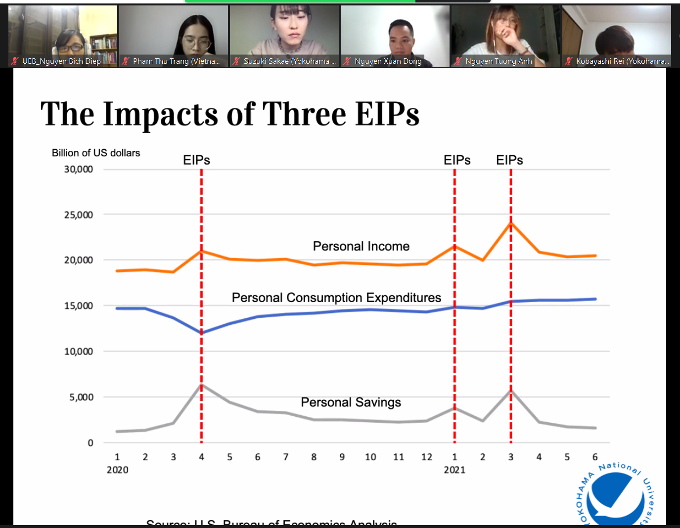 2021年10月29日(金)と11月1日(月)の両日、経済学部はベトナム国立大学(Vietnam National University, University of Economics and Business-VNU-UEB)とのオンライン討論会を実施しました。今年4月に参加者を募集し8名の学生が選抜され、準備を開始しました。アレクサンダー・マッコーレー教授とクレイグ・パーソンズ教授がプログラムを担当し、YNUの博士課程を修了したベトナム側のグエン・スアン・ドン先生と共に協力しながら進めてきました。それぞれのコホートの学生は、「我が国におけるCovid-19の経済的影響・社会的影響」のプレゼンテーションを行いました。