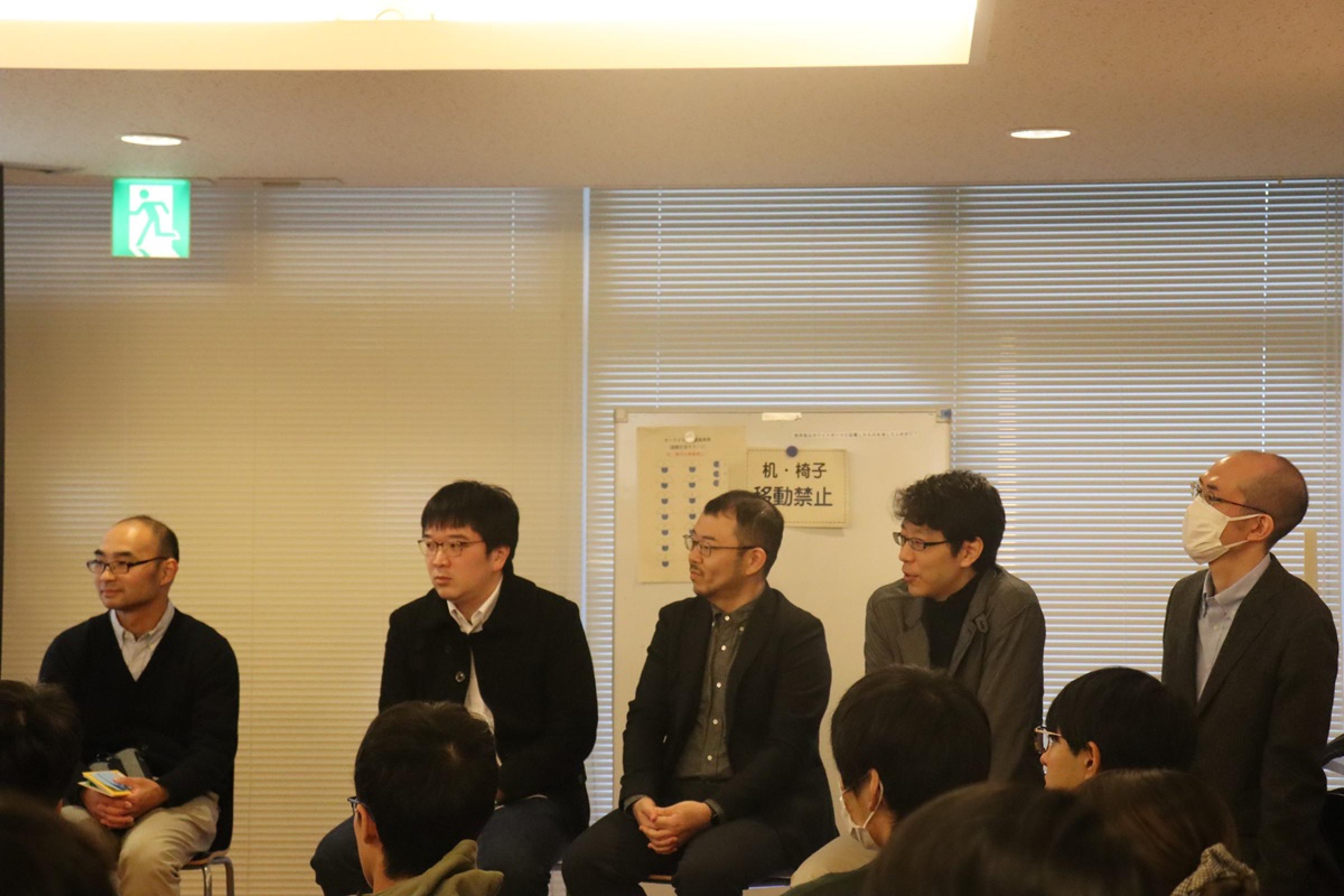 座談会はパネルディスカッション形式で進められ、5名の教授が登壇しました。会場には1~4年生の学生が20名以上参加し、終始明るく和やかな雰囲気に包まれていました。